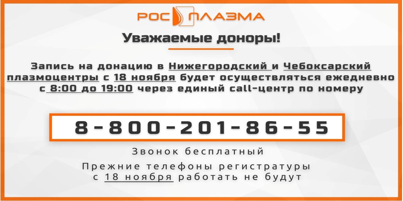 Единый номер для записи на донацию в Нижегородский и Чебоксарский плазмоцентры