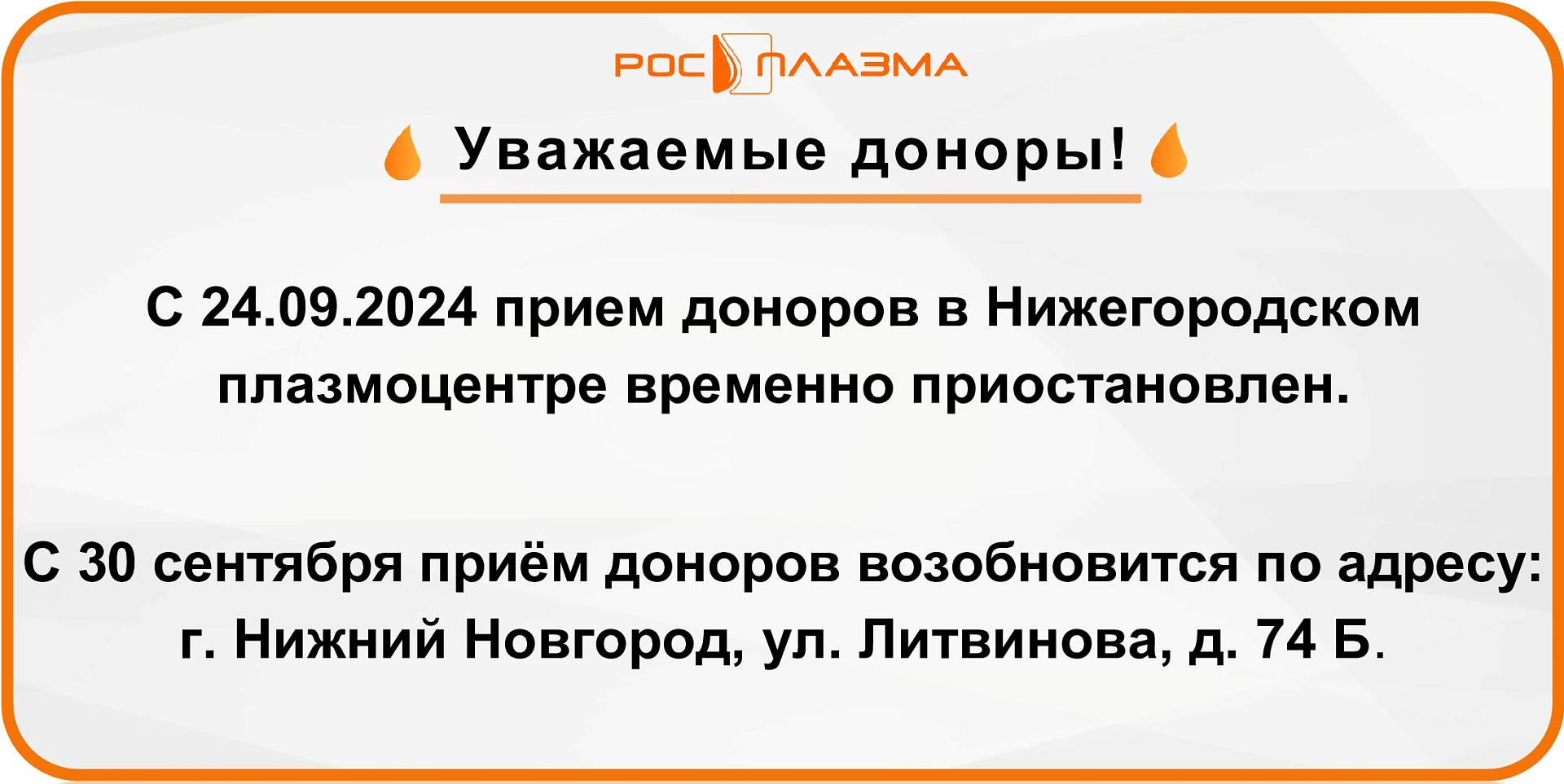 С 30 сентября прием доноров возобновится по адресу: г. Н.Новгород, ул. Литвинова, д. 74 Б.