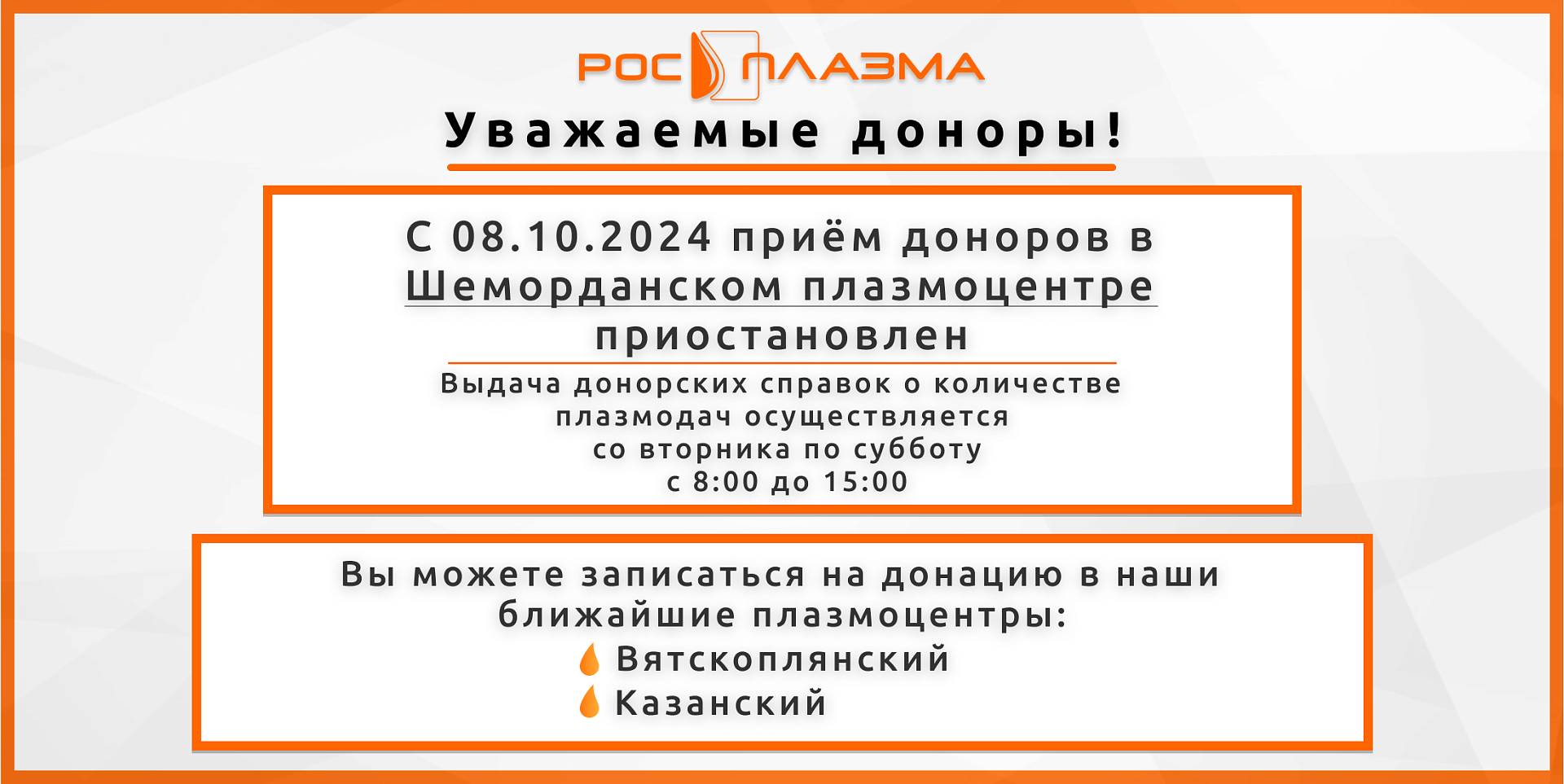 С 08.10.2024 прием доноров в Шеморданском плазмоцентре приостановлен.